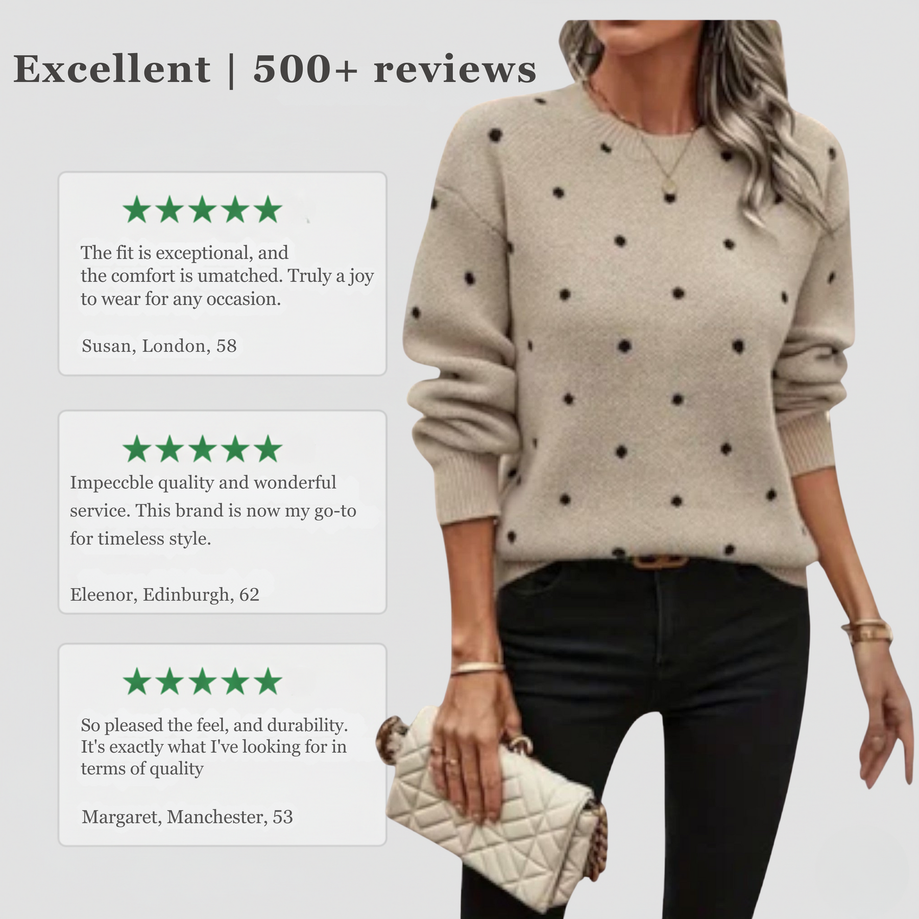 The Ava Long-Sleeve Knit Sweater is the perfect addition to your wardrobe this season. With its timeless polka dot pattern and cosy knit fabric, it brings style and comfort together. Thanks to the relaxed fit and versatile design, the sweater can be effortlessly paired with jeans, skirts, or trousers – ideal for cool days and cosy moments. Whether you're strolling through the city or enjoying coffee with friends, the Ava Sweater ensures you always look stylish and feel completely comfortable.